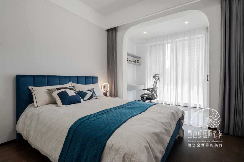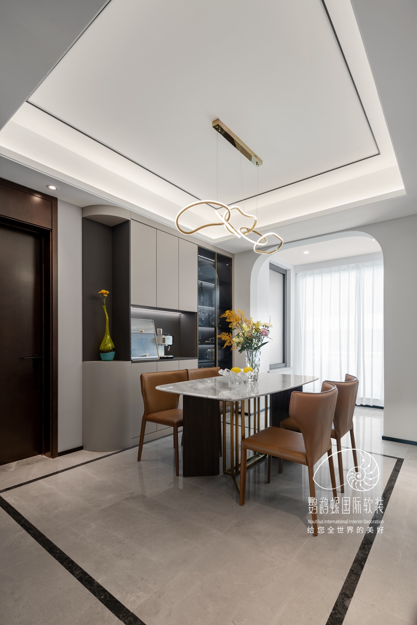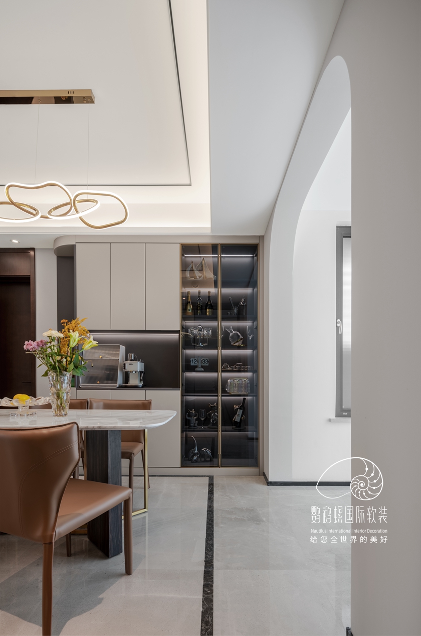 本案以白色与咖色作为空间的主色调,,,灰蓝色和棕色被巧妙搭配,,,从色彩给人恬静温馨、岁月静好之感。。。。。。醒目的弧形门将各个空间串联起来,,,在直线条的房间里给人以视觉上的缓冲,,,复古的设计感和新鲜感瞬间拉满。。。。。。