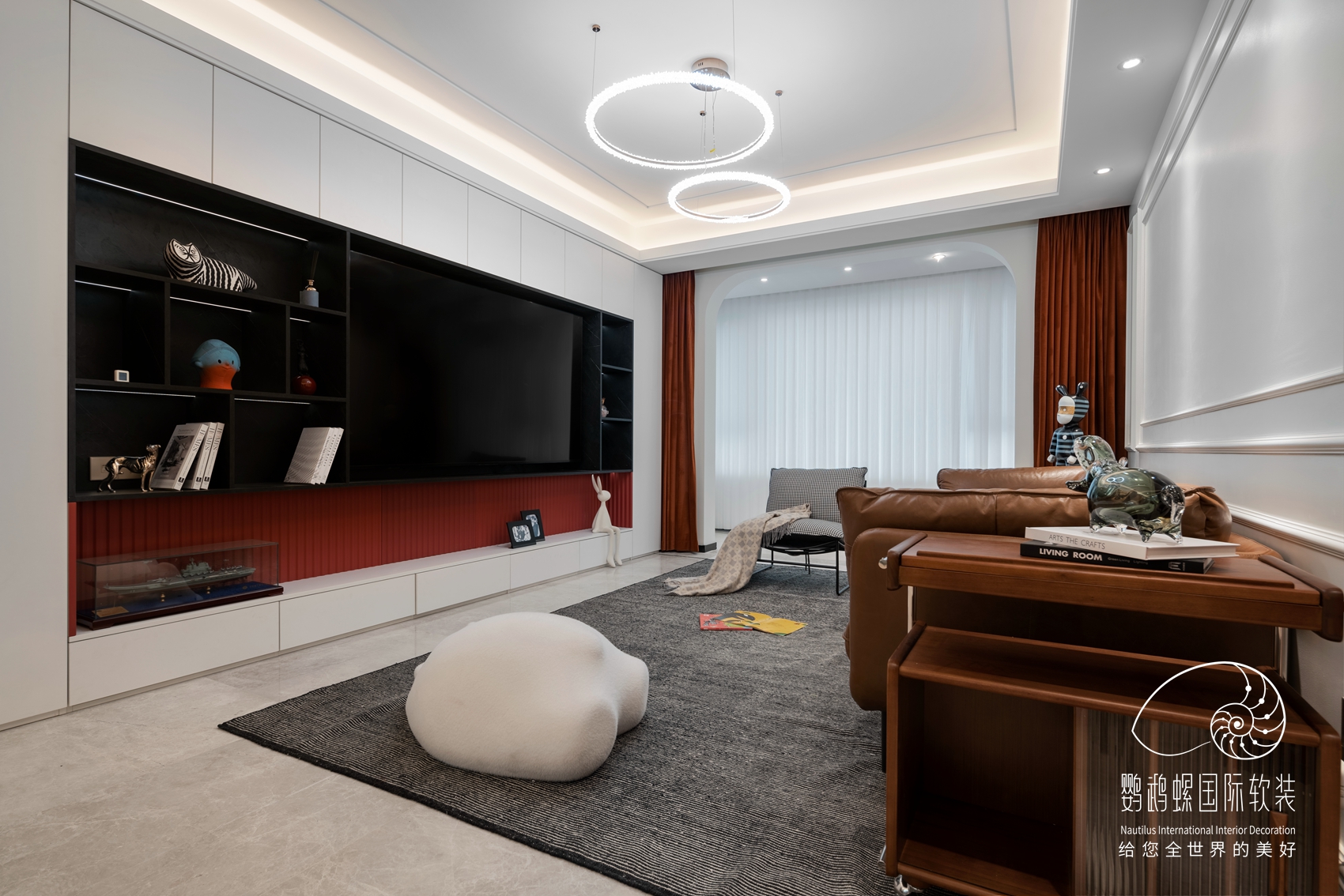 整面的通顶收纳柜超等能装,,,,,85寸电视做内嵌,,,,,横向设计增强视觉拉伸感,,,,,留空格栅板跳色,,,,,增添呼吸感。。。